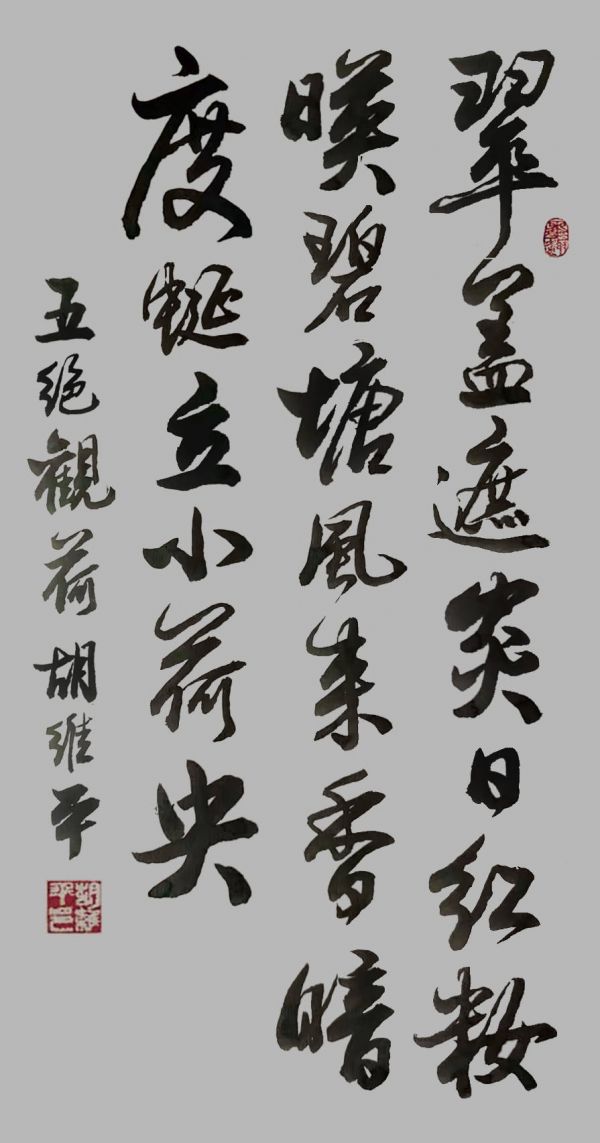书法创作方面,胡维平对古人咏荷诗词进行了精彩绝伦的再现。宋代诗人苏泂的《荷花》诗,将荷花比作妆容精致的美人,荷叶摇曳的翠绿姿态跃然纸上。胡维平以草书、行书两种书体书写此诗,并配以临摹徐渭的写意荷花画作,形成了诗、书、画三位一体的艺术再创。作品中笔势奔放洒脱、结构严谨有序,既保留了原诗的意境,又展现了书法的韵律美。周邦彦《苏幕遮·燎沉香》中描写荷塘的句子,胡维平以草书形式书写,笔墨苍劲有力、转折流畅自然,尤其在“荷叶”与“荷花”之处的点画处理,巧妙地突出了荷的轻盈与水的流动感,配图更展示了其草书风貌,精准捕捉了词中的荷意。