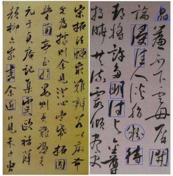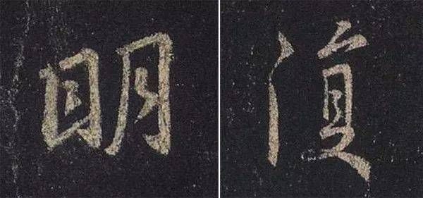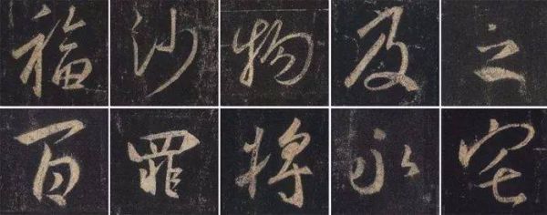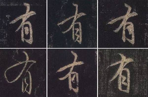 在《圣教序》中,王羲之结字表现淋漓尽致。该方的方,该圆的也一定圆,长的长短的短,字形特征被强调,字体动感十分明显,字和字之间字形区别变化无常,如下图,方圆尽得其势。
