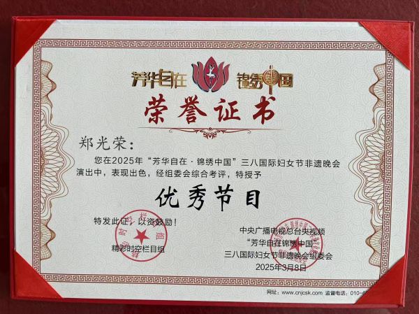 郑光荣获“芳华自在”非遗晚会优秀节目奖