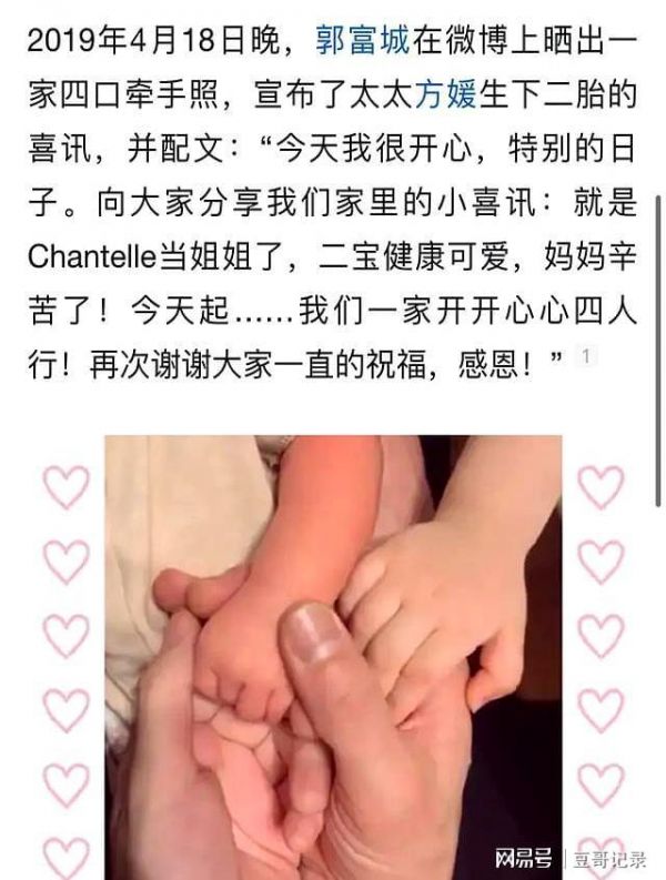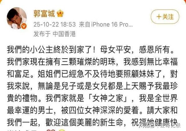 郭富城官宣三胎产女晒照,称家有三颗璀璨明珠