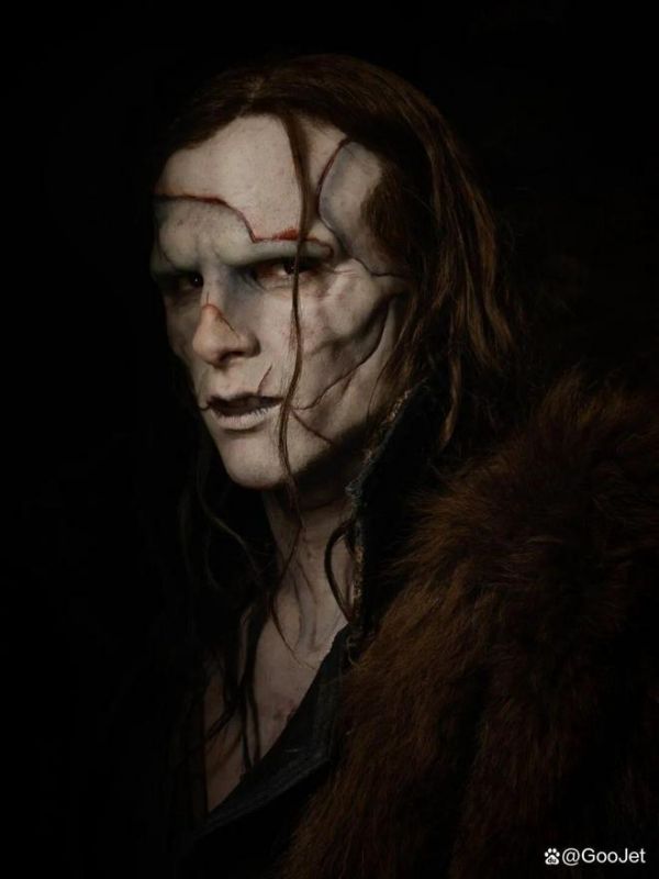 这次为了角色,每天化妆10小时,贴了42块假体,头颈部就有14块。皮肤是灰白半透明,能隐约看到血管,像把人体内翻出来。