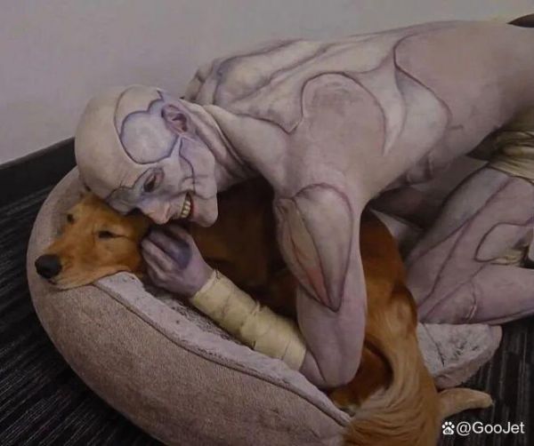 衣服从破斗篷到敞开胸口,一层层裹着,越到后面越驼背,像被世界伤透的少年。Jacob Elordi 自己发过一张剧照:怪物妆抱着自家狗 Layla,诡异中带点萌,但那双眼睛一瞪,瞬间吓人。