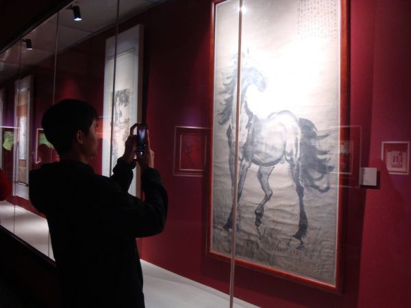 10月23日,观众在成都宝光寺拍摄徐悲鸿画作。新华社记者 康锦谦 摄