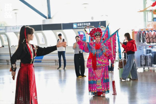 展览开幕式,在国风音乐中拉开帷幕,由齐素琼、周锦圆联袂表演的国风越歌《出征》,激昂澎湃,演绎出古今交融的高远情怀;随后,一人一艺“伶”国风乐团带来的新民乐《马灯调》,在传统曲调中注入轻快时尚的编曲,令人耳目一新。精彩的表演为南来北往的旅客创造了一次独特的“文化邂逅”。