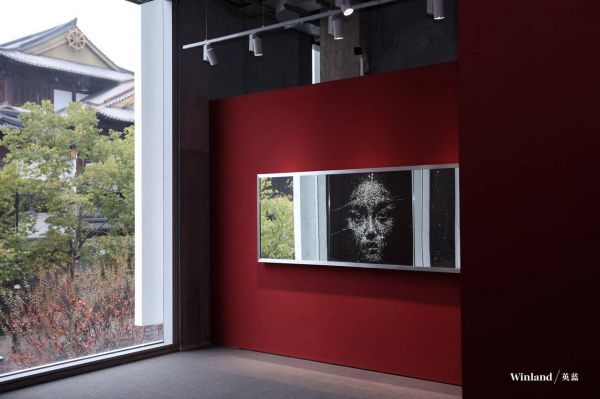 在展厅二楼,两幅玻璃肖像相对悬挂,分别代表白素贞与许仙。它们倒置悬挂,唯有通过地面上一面象征湖水的镜子,才能看到两者间的分界——人与妖、仙与凡。