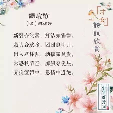 班婕妤汉成帝刘骜妃子,西汉女作家,古代著名才女,是中国文学史上以辞赋见长的女作家之一。善诗赋,有美德。初为少使,立为婕妤。现存作品仅《自伤赋》、《捣素赋》和一首五言诗《怨歌行》(亦称《团扇歌》)三篇。