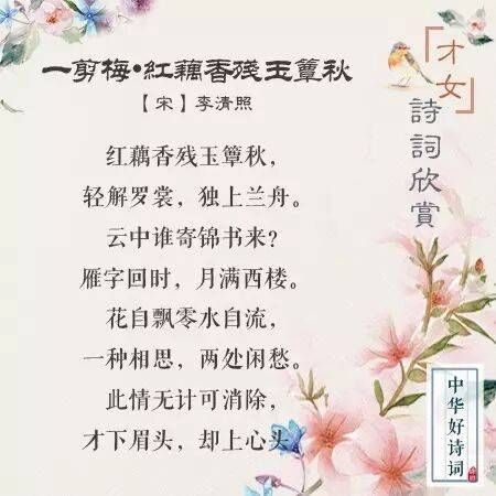 淑真(约1135~约1180),号幽栖居士,南宋著名女词人,是唐宋以来留存作品最丰盛的女作家之一。现存《断肠诗集》、《断肠词》传世,是劫后余篇。