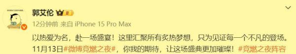 北京时间11月3日下午4点18分,郭艾伦在个人社交媒体上宣布将于本月13日空降京城参加一场重要的活动。这次活动不仅将涉足跨界领域,还将再次尝试他的脱口秀表演,引起了众多粉丝的期待。