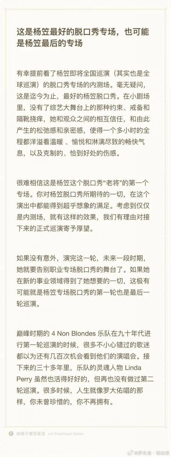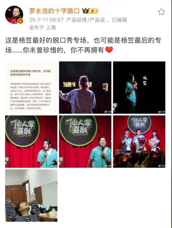 今年7月,罗永浩曾发长文点评杨笠的脱口秀专场,更透露:“如果没有意外,演完这一轮,未来一段时期,她就要告别职业专场脱口秀的舞台了。如果她在新的事业领域得到了她想要的一切,这极有可能就是杨笠专场脱口秀的第一轮也是最后一轮巡演。”