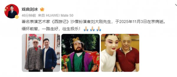 11月7日消息,《西游记》“沙僧”扮演者刘大刚因病去世!戏曲演员、豫剧大师马金凤弟子刘冰在社交平台上发文悼念刘大刚:“著名表演艺术家《西游记》沙僧扮演者刘大刚先生,于2025年11月3日在京病逝。缅怀前辈,一路走好,往生极乐!”