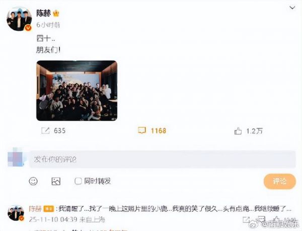 11月9日,陈赫在40岁生日这天,结结实实给网友们带来了一轮“找茬”挑战。当晚他在微博晒出星光熠熠的生日聚会大合照,配文“四十 朋友们!”,却因好友鹿晗在照片中“隐身”而意外引爆热搜。