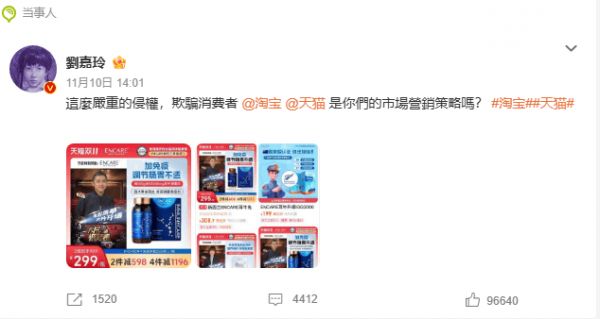 11月10日,演员刘嘉玲公开向淘宝、天猫平台发声,直指平台存在欺骗消费者的侵权行为,引发广泛热议。她在文中质问:“这么严重的侵权,欺骗消费者@淘宝 @天猫 是你们的市场营销策略吗?”同时附上的图片显示,淘宝天猫平台上“ENCARE海外旗舰店”(标注“天猫国际”标识)售卖“新西兰ENCARE耳牛免疫球蛋白”时,首页宣传图擅自使用了梁朝伟的半身照片。