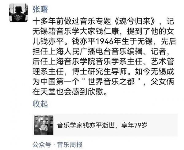 据“音乐周报”微信公众号消息,无锡籍音乐学家上海音乐学院学科带头人钱亦平教授,于2025年11月16日在上海华东医院逝世,享年79岁。