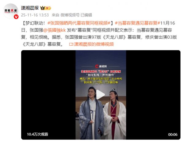 11月16日,张国强在社交平台发布了一段两代“慕容复”同框的视频,还配文感慨:“当慕容复遇见慕容复,相见恨晚。”