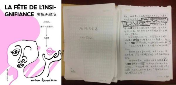 米兰·昆德拉作品《庆祝无意义》中文版书封和马振骋的翻译手稿