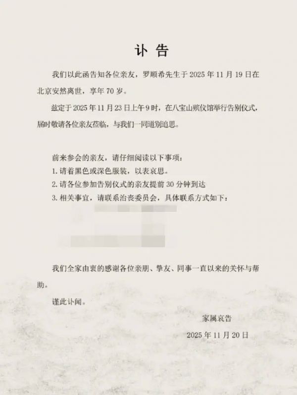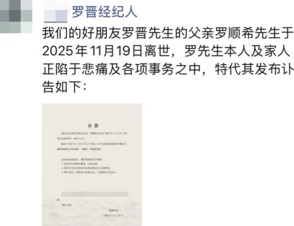 11月20日,罗晋经纪人在朋友圈发布讣告,悲痛地宣布罗晋的父亲罗顺希先生于11月19日在北京安然离世,享年70岁,告别仪式将于23日上午9时举行。