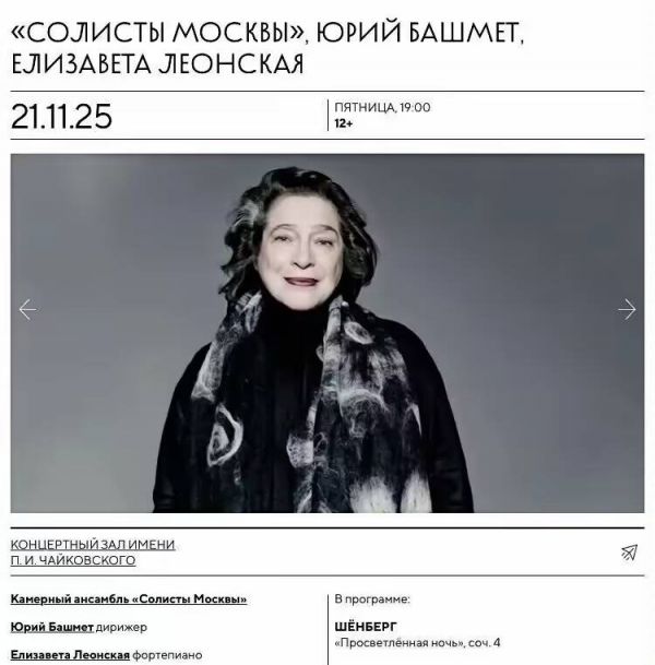 荷兰埃因霍温音乐厅不再欢迎钢琴大师伊丽莎白·莱昂斯卡娅(Elisabeth Leonskaja)。音乐厅在一份声明中宣布,她原定于12月4日举行的舒伯特独奏音乐会已被取消。