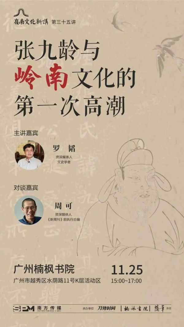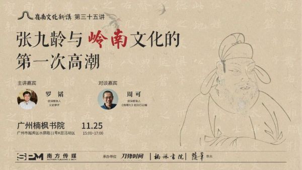 11月25日下午,岭南文化新讲第三十五讲《张九龄与岭南文化》将在广州楠枫书院举行。本次讲座特邀文史学者罗韬先生主讲,从历史语境与文化脉络出发,深入解读张九龄的政治成就、文学地位,及其对岭南的深远影响。资深媒体人、《新周刊》前执行总编周可先生将主持本次活动。