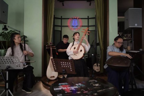 手碟、邦戈鼓、中东鼓、二胡、中阮、琵琶……四位乐手手中的乐器,玲琅满目。演出间隙,他们会介绍乐器、曲目背景、创作想法,打破艺术距离。观众们手捧着咖啡、品尝着甜点,不必拘谨着装,也不用正襟危坐,在轻松自在的氛围中观演。