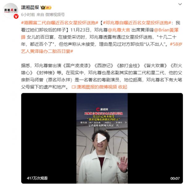 邓兆尊曝女艺人曾和6位富豪交往 怀孕后没人承认但获丰厚分手费