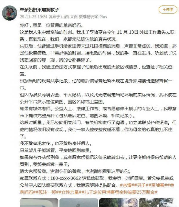 根据“单亲妈妈柬埔寨救子”发布的相关信息,其子李怡亨的最后信号,曾在境外柬埔寨班迭棉吉省区域短暂出现过。“失联后,他曾通过手机给家里传来过几段模糊的消息,声音非常虚弱。”“直到现在,我们一家都无法确认他的真实状况。”