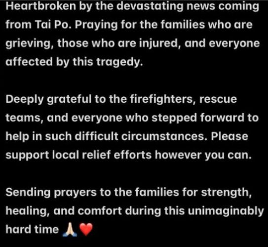 11月26日,香港大埔宏福苑发生重大火灾引发广泛关注,杨紫琼在社交平台发文为香港同胞祈福。她坦言听到这一噩耗后“我心碎不已”,特地为火灾中悲痛的逝者家属、受伤人员以及所有受影响的民众送上祈祷:“愿逝者家属在这段艰难时期里,能获得力量、疗愈与慰藉。”同时,她也向奋不顾身参与救援的消防员及其他挺身而出的工作人员表达了由衷感谢。