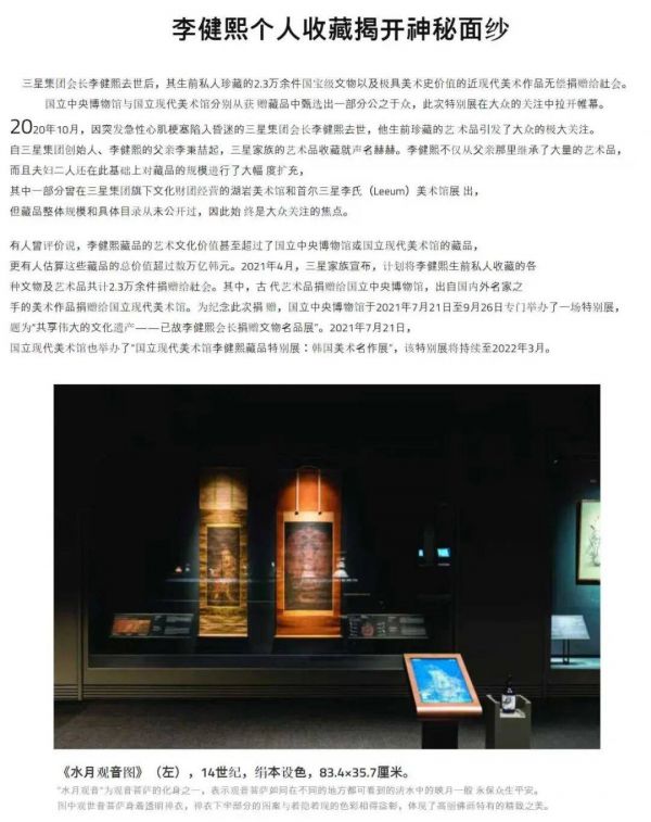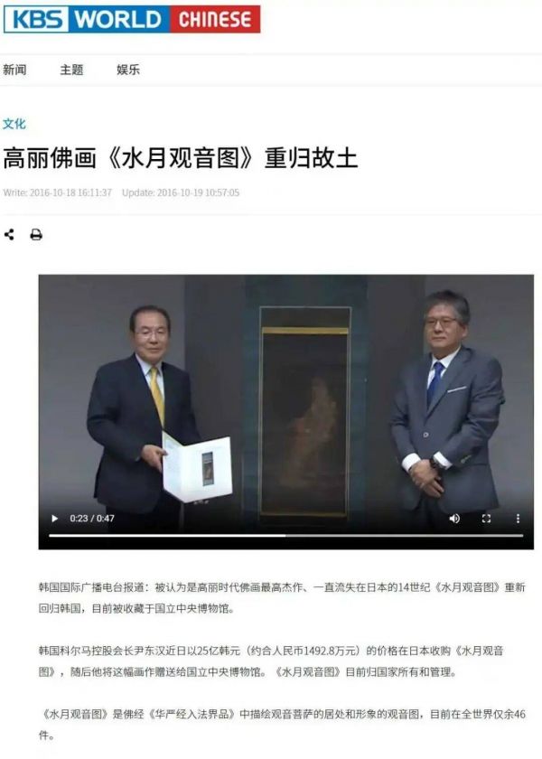 据韩国媒体报道,韩国不少富豪对高丽水月观音图情有独钟,韩国首富前三星集团会长李健熙曾收藏一幅《水月观音》,虽然尺寸相对不大,但仍被视为他最重要的收藏之一。科尔马控股会长尹东汉曾以25亿韩元(约1492.8万元人民币)的巨资在日本购得一幅《水月观音图》,后无偿捐赠给国立中央博物馆,被许多人视为《水月观音图》价值体现的象征性事件。