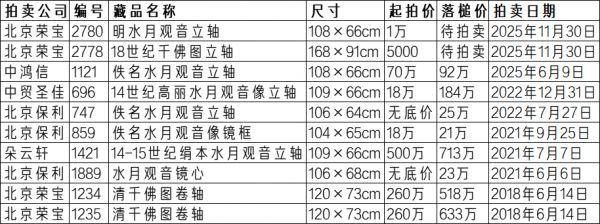 2022年中贸圣佳以18万元起拍的一件14世纪高丽水月观音,最终以184万元成交,溢价率超过900%,进一步激活了藏家对高丽佛画水月观音题材的兴趣。到了2025年,中鸿信拍出的一件佚名水月观音立轴,从70万元起拍、92万元落槌,显示出佚名作品仍具有强劲的市场基础。值得注意的是,北京荣宝在2025年11月30日秋季拍卖中,将推出起拍价仅1万元的《明水月观音立轴》,预期将再度引发竞逐风潮,这种“低起拍高预期”的策略正是近年来佛画板块最具活力的市场现象之一。