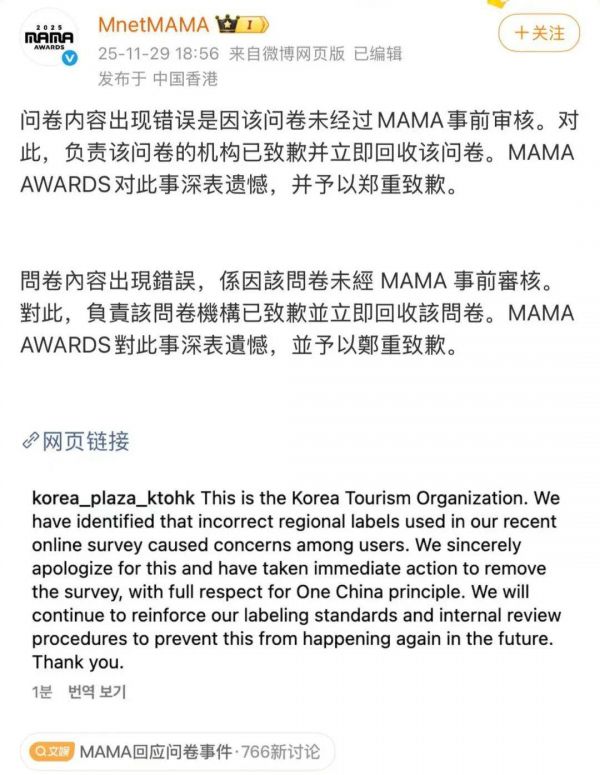 问卷内容出现错误是因该问卷未经过MAMA事前审核。对此,负责该问卷的机构已致歉并立即回收该问卷。MAMA AWARDS对此事深表遗憾,并予以郑重致歉。