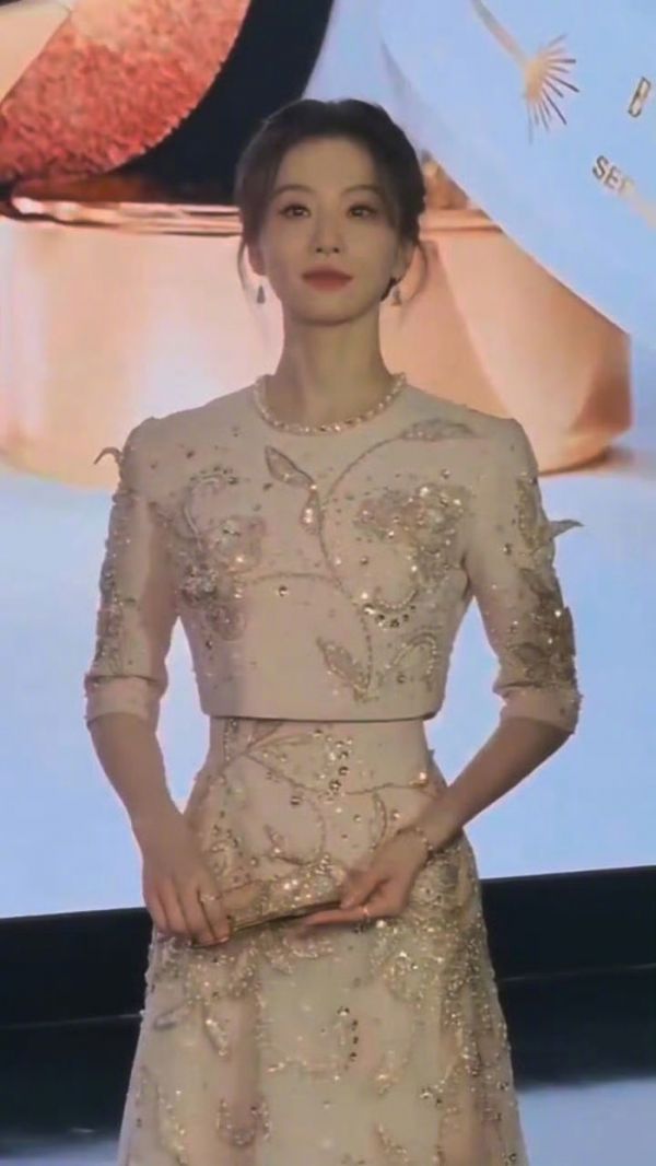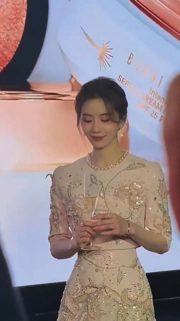 刘诗诗浅粉碎钻套装亮相,盘发造型温婉大方