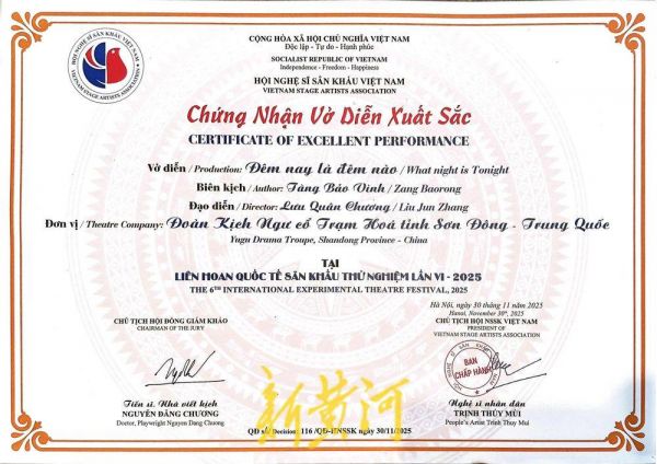 11月30日,从越南举行的2025年第六届国际实验戏剧节传来喜讯,首次走出国门的沾化渔鼓戏《今夕何夕》斩获特等奖,3名主演王巧玉、王帅、孙鹏程分获演员一等奖,《今夕何夕》还获得本届戏剧节唯一的作曲奖。