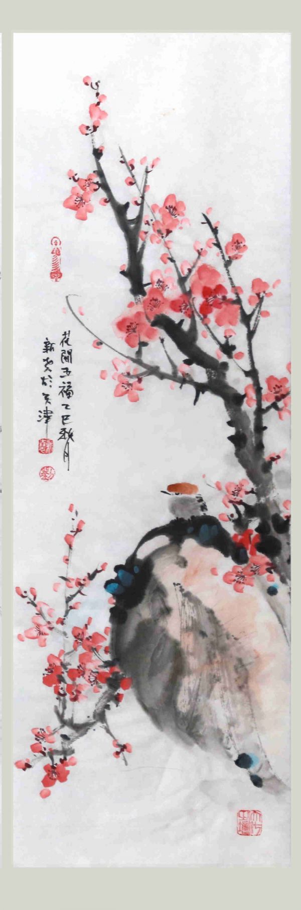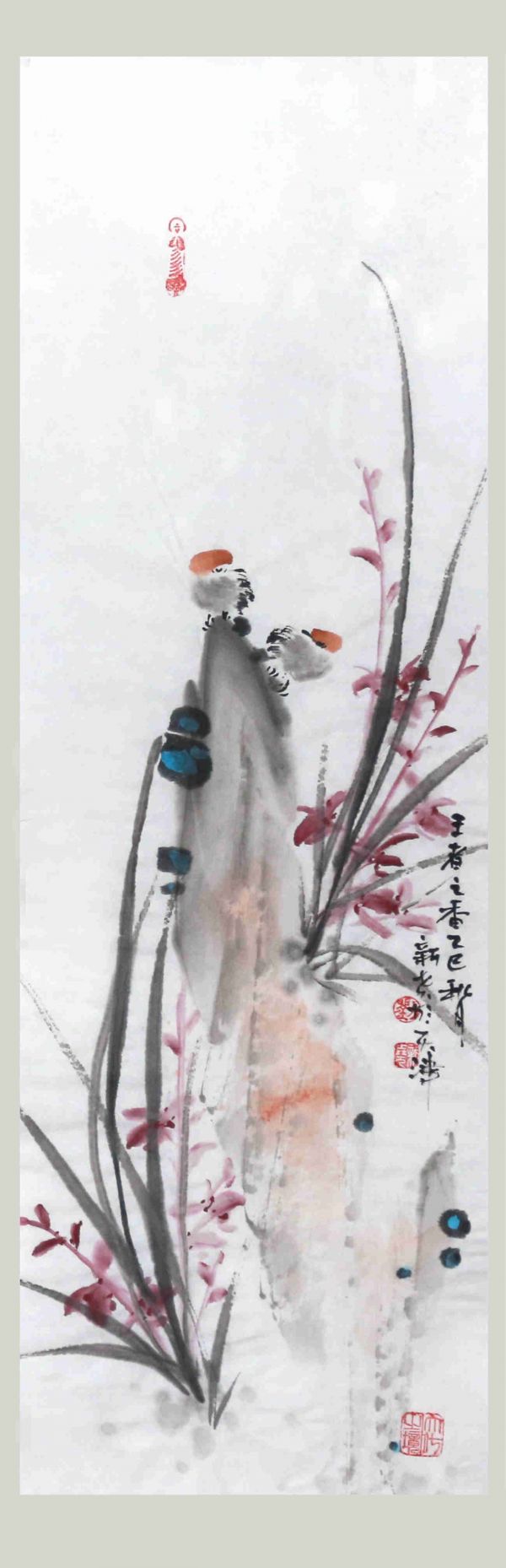 刘新尧笔下的梅花,老枝虬曲,红梅绽放,浓淡相间,显出“疏影横斜”之姿;题“花开五福”,既应梅花报春之意,又寓吉祥之愿。红梅与岩石对比,更显其“已是悬崖百丈冰,犹有花枝俏”的傲骨,此幅笔墨苍劲,却见生机,恰是“四君子”之首的气魄。