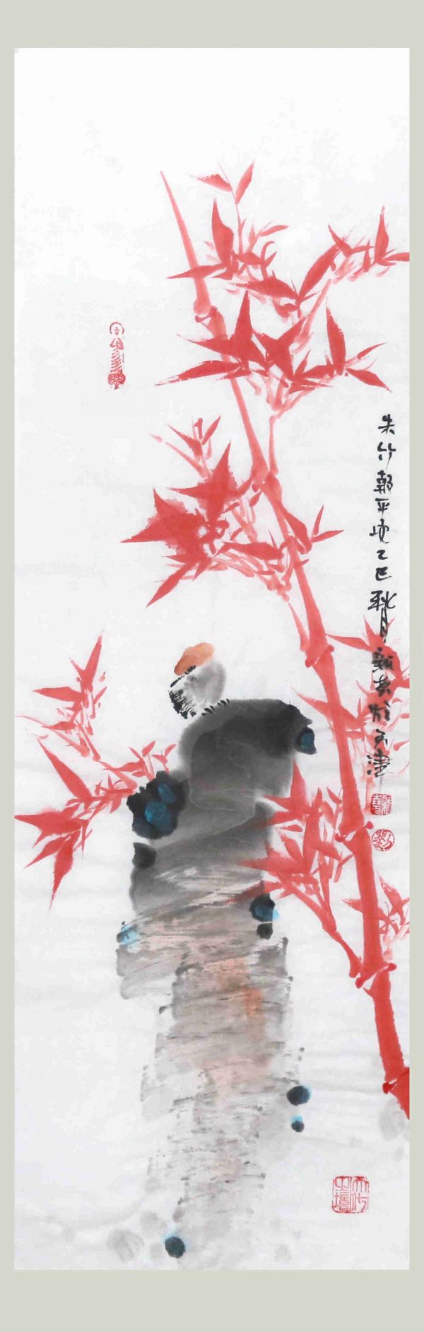 竹是刘新尧最富生命力的表现题材之一。此幅《朱竹报平安》,以朱砂绘竹,红竹挺拔,节节向上,留白处显空灵。刘新尧师承霍春阳,深得“以书入画”之精髓,竹叶以行草笔法挥就,疏密有致,如风中摇曳;朱砂之用,非俗艳,而显清雅,与墨石形成冷暖对比,更显竹之孤高。