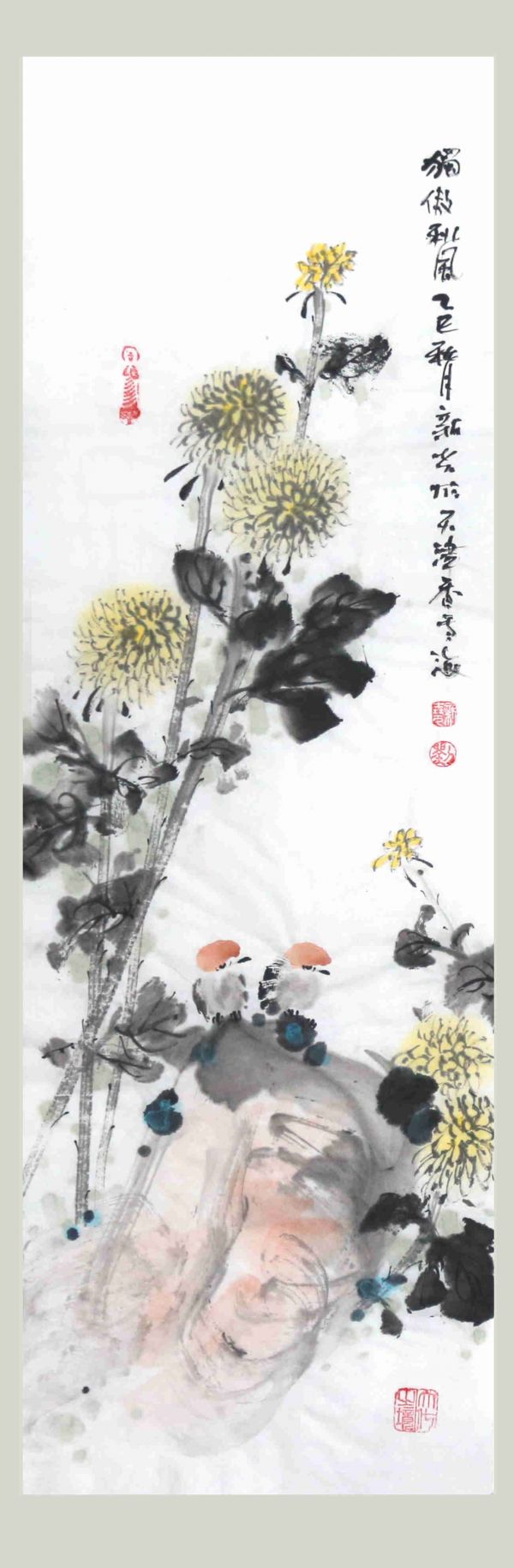 菊花在其笔下,墨叶如铁,黄菊绽放,或含苞、或盛放,错落于嶙峋石旁。刘新尧以篆书笔意勾菊茎,劲挺如铁,叶片则以浓淡墨晕染,显秋叶之苍厚;花朵以藤黄点染,不求工整,而得野逸之趣。石畔小字题“独傲秋风”,恰点出菊之风骨——不与群芳争春,独守寒秋之寂。此幅笔墨简淡,却见蓬勃生气,正是“画中有诗”的文人境界。