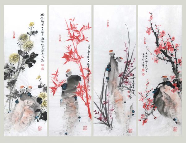 在当代花鸟画领域,津门画家刘新尧以“四君子”为专攻,于传统文脉中淬炼新意,其作品既承霍春阳教授的文人画风骨,又显个人独特的笔墨情怀。观其《梅兰竹菊》四条屏,恰似步入一片清雅之境,每一笔皆见性灵,每一墨皆含气韵。