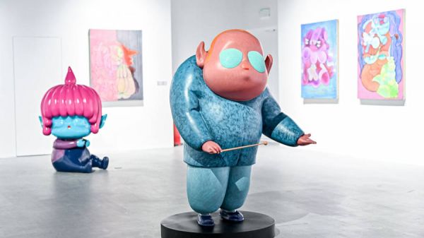 雕塑作品则以多元材质呈现奇趣质感,玻璃钢、铸铜、不锈钢等材质的运用,让精灵、萌物等奇幻形象跃然眼前,既有夸张造型传递的童真趣味,也有金属质感带来的现代审美,与油画作品形成材质与视觉的巧妙对话,丰富了展览的层次与体验。