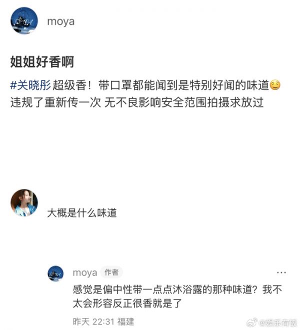 #关晓彤好香啊##关晓彤 偏中性带一点沐浴露香气# 网友分享偶遇@关晓彤 ,形容晓彤超级香,类似于“偏中性带一点点沐浴露”那种味道,不是香水而是接近体香的感觉,羡慕网友了
