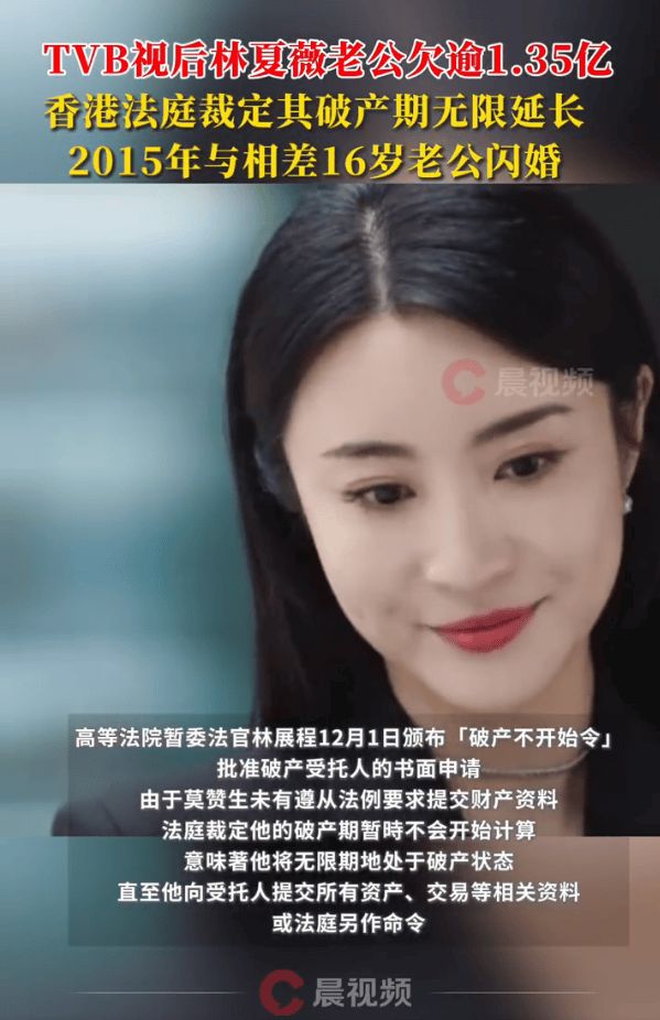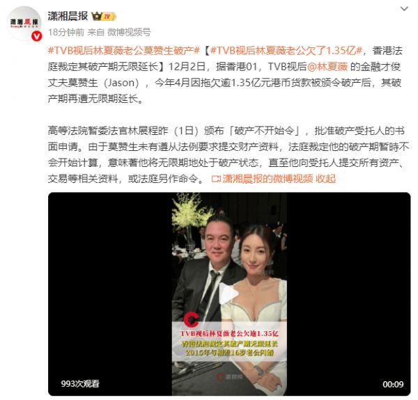 12月2日消息,TVB 视后林夏薇的丈夫、金融从业者莫赞生(Jason),今年4月因拖欠超1.35亿港币货款被法院颁令破产,如今其破产期已被裁定无限期延长。