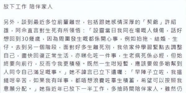 佘诗曼和许绍雄亲如父女,她说当天在灵堂跟很多人聊天,特别想回到30岁,因为那时候都是开心的事,比如拍拖、结婚、生子,去到另一个阶段,她现在要调整自己,尽快恢复正常生活,生老病死是自然的,人生短暂,应该多做有助于他人的事情,前段时间立了遗嘱,坦言自己赚钱很辛苦,如果她出事了,不想浪费毕生积蓄,希望按照意愿分配。