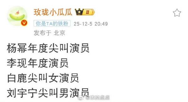 尖叫之夜奖项来啦杨幂年度尖叫演员、李现年度演员、白鹿尖叫女演员、刘宇宁尖叫男演员女神一直都是白鹿,男神从刘宇宁到敖瑞鹏到檀健次……现在又回到刘宇宁~现在的悬念就是男神花落谁家了吧 真给足了白鹿排面,旁边都在变,只有C位女王不变 可信吗?符合期待吗?#爱奇艺尖叫之夜#,#白鹿曾因番位之争错失想合作的演员#,#微博兴趣创作计划#