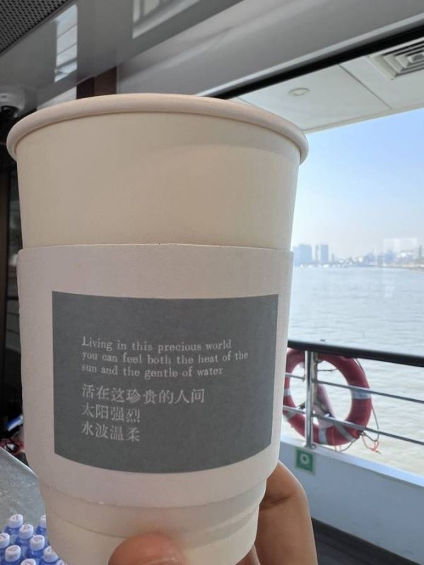满载中外诗人的游轮上,每层台阶间隙贴上中英文诗歌——“不需要太阳,也不需要辽阔的天空,我生活在静静的黑暗中”;咖啡杯的杯套上印着“活在这珍贵的人间/太阳强烈/水波温柔”双语诗句……