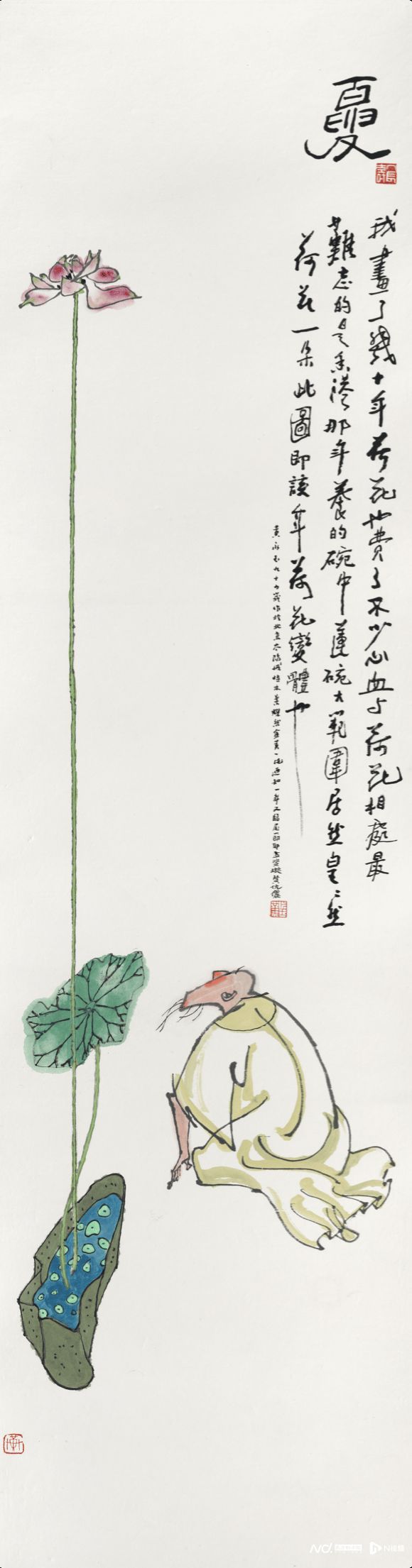 题跋:夏 我画了几十年荷花,也费了不少心血与荷花相处,最难忘的是香港那年养的碗中莲。碗大范围居然皇皇然荷花一朵,此图即该年荷花变体也。黄永玉九十四岁作于北京太阳城 时木叶灿然金黄一片,乃知一年又临尾节耶 孟斐璇贤伉俪