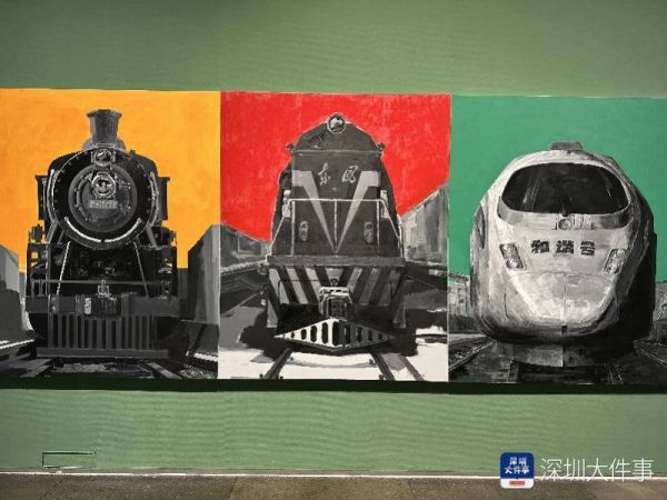 此次展览现场以灰绿色、赭石色为基调,营造出绿皮火车般的怀旧氛围。序厅以《奔腾·岁月》开篇,描绘中国铁路发展的3个重要阶段——蒸汽时代、内燃机时代与动车时代,红、黄、绿、黑、白的色彩语言充满情感张力,作品中的机车主体以黑、白、灰为主色调,尽显硬朗雄厚的力量感;而背景的红、黄、绿三种高饱和度纯色,则为机械的冰冷感赋予了强烈的当代视觉冲击力。观众得以从中国铁路的巨变中,真切感受到中国的飞速发展和时代变迁。