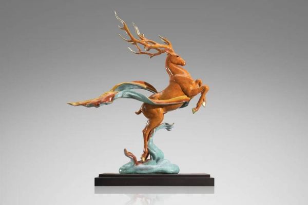 此次入藏的《千浪卷雪》《万里长城》《千里江山》等作品立意高远,气势磅礴,彰显中华美学的雄浑气魄;《国鹿》《青花铜瓶》源于传统,分别以独特的“动感”塑造和精妙的色彩搭配,凸显创新意义;《燃烧的向日葵》以鲜明的创新特质见长,运用熔铜手法塑造了富有生命力的向日葵形象,不仅体现中华美学意蕴,而且富有现代气息,形成与西方艺术的对话。