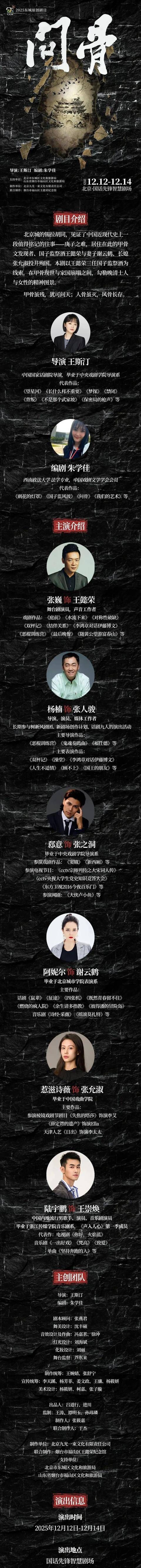 据介绍,由张巍、杨楠、郄意等演员主演的话剧《问骨》,首轮演出自12月12日起连续三天登陆国家话剧院先锋剧场。该剧作为“大戏东望·2025全国话剧展演季”原创单元重点剧目,后续将启动全国巡演,推动甲骨文文化走向更广泛受众。