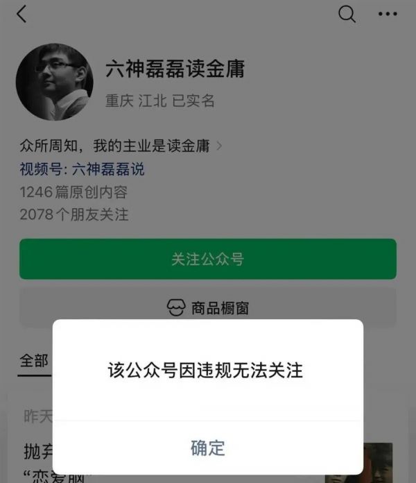 12月14日中午,记者注意到,粉丝众多的微信公众号“六神磊磊读金庸”因违规无法关注。已关注该号的网友,可以正常打开他的往期大部分文章;未关注该号的网友,无法通过搜索关注。