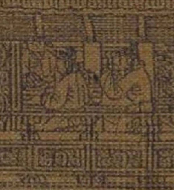 如果借助放大镜,你甚至可以看到正脊上连绵的花纹,望兽张口露出的长吻与尖利的牙齿,你会看到悬鱼上雕刻的卷曲云头,栏杆华版上装饰的团花瑞草,如果你看得足够仔细,你甚至能看到坐在楼上的三个戴着垂脚幞头,穿着圆领袍的士人,正在宴饮酬酢,其中的一个人已经举起了酒杯,而在他们面前的桌子上还摆着一只牙盘,盛放着蒸肉之类的美味佳肴。而那佳肴的大小,竟与画绢上的五六股绢丝的尺寸相当。