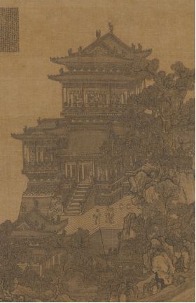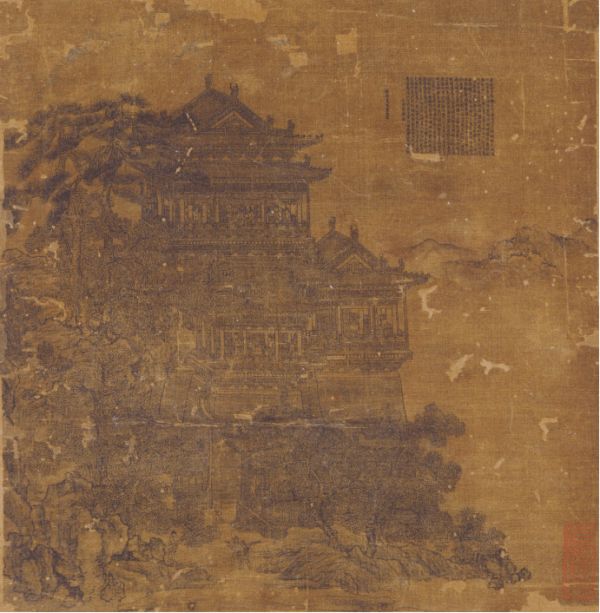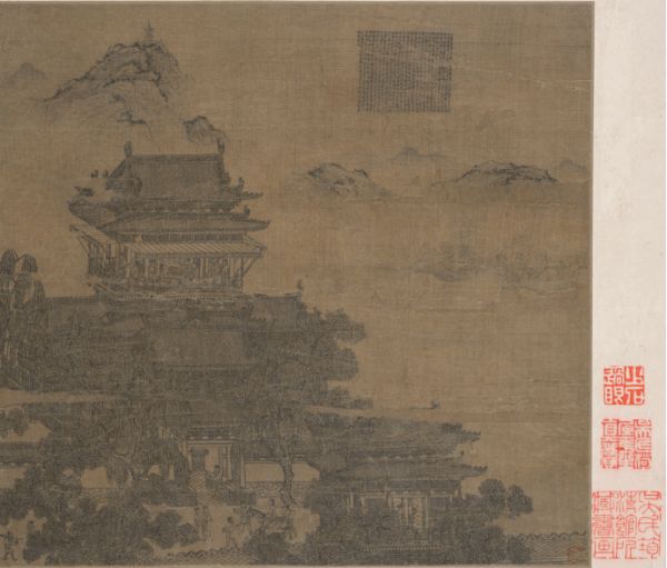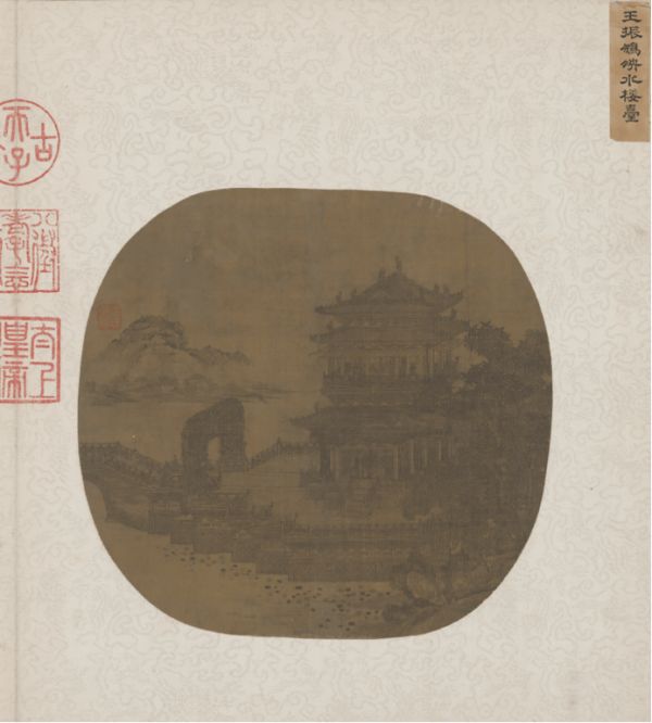 王振鹏“尝为《大明宫图》以献,世称为绝”,由此可知,乾隆明确认为该图作者是王氏。画上另有旧签“王振鹏映水楼台”同样指向该种判断。