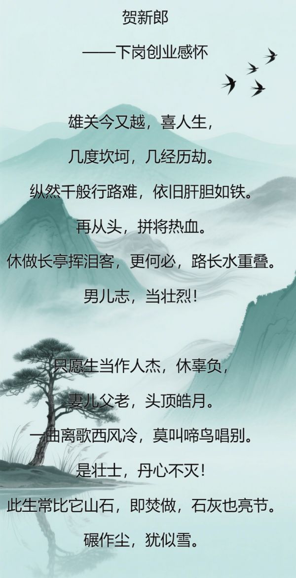 尤为值得称道的是 “词牌气质与内容的高度适配”:贺新郎的豪放激昂,恰好承托了 “下岗创业” 里的坚韧与壮志 —— 每一处呐喊(男儿志当壮烈)、每一个比喻(肝胆如铁、石灰亮节),都贴合词牌的沉雄基调,让 “困境抒怀” 跳出了小情小绪,拥有了豪放词的开阔气场。