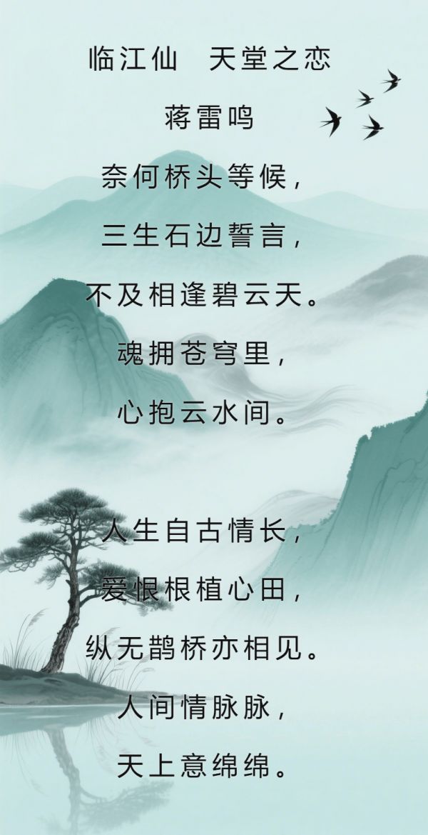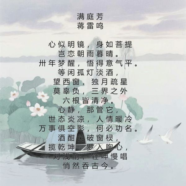 综上所述,《贺新郎・下岗创业感怀》是一篇豪壮与深情兼具的词牌佳作,蒋雷鸣老师以困境为纸、以壮志为笔,既写尽下岗创业的坚韧突围,更抒出男儿的品格风骨,既见豪放词的气场,更显人生的重量。